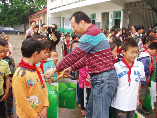 “谢谢叔叔!”2012年5月24日安吉县良山民工子弟学校和梅园学校的同学们在拿到学习大礼包时向集团陈小平副总表达了自己的感激之情。此次,浙江博瑞控股集团参与了安吉县广播电视台新闻综合频道、生活娱乐频道、《安吉视窗》网、安广《视界》报及城市大屏联合发起的“幸福安吉,送爱进校”的活动,为贫困学生带去一份温暖,送上一份欢乐,让他们过一个有意义的“六一”儿童节,让贫困地区的孩子们感受到关爱无处不在,使孩子们树立起远大理想,努力学习,健康发展。