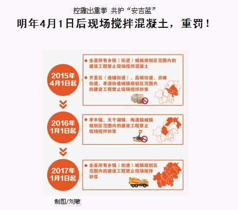 《通知》要求,2015年4月1日起我县所有乡镇(街道)城镇规划区范围内的建设工程禁止现场搅拌混凝土。同时,依据乡镇实际情况,将分三个时间节点,逐步在2017年1月1日后实现所有乡镇(街道)城镇规划区范围内的建设工程禁止现场搅拌砂浆。