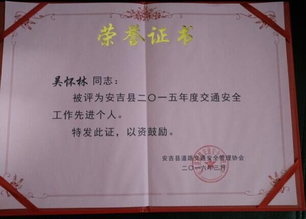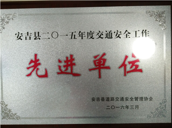 近期,安吉县道路交通安全管理协会授予浙江博瑞控股集团有限公司“二O一五年度交通安全工作先进单位”,授予吴怀林同志“先进个人”荣誉称号。